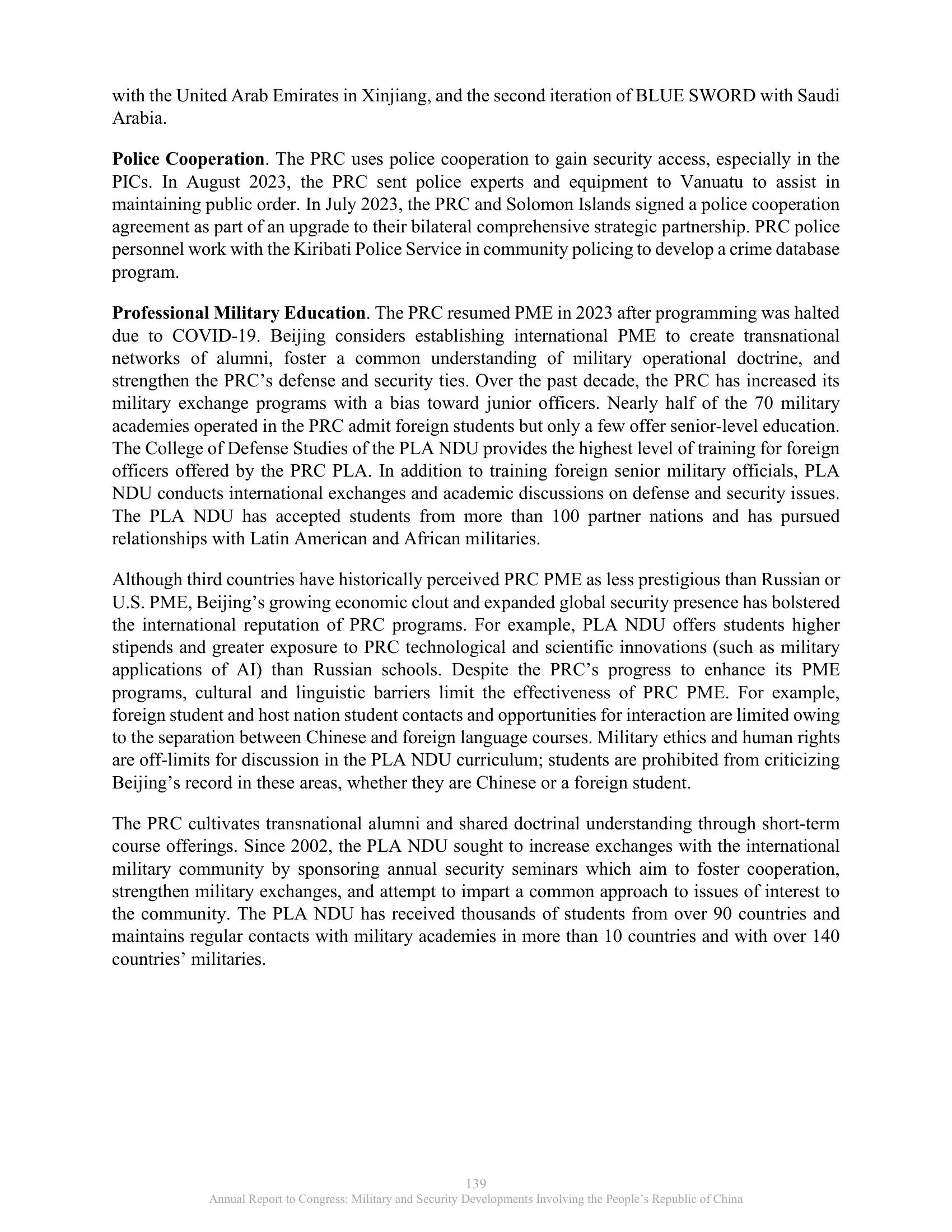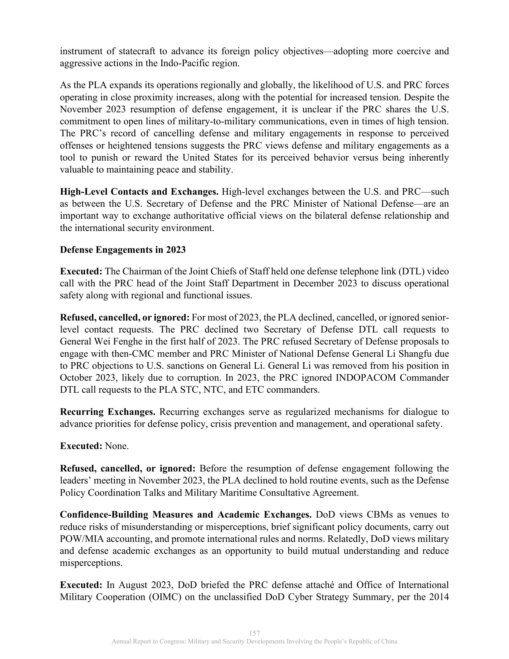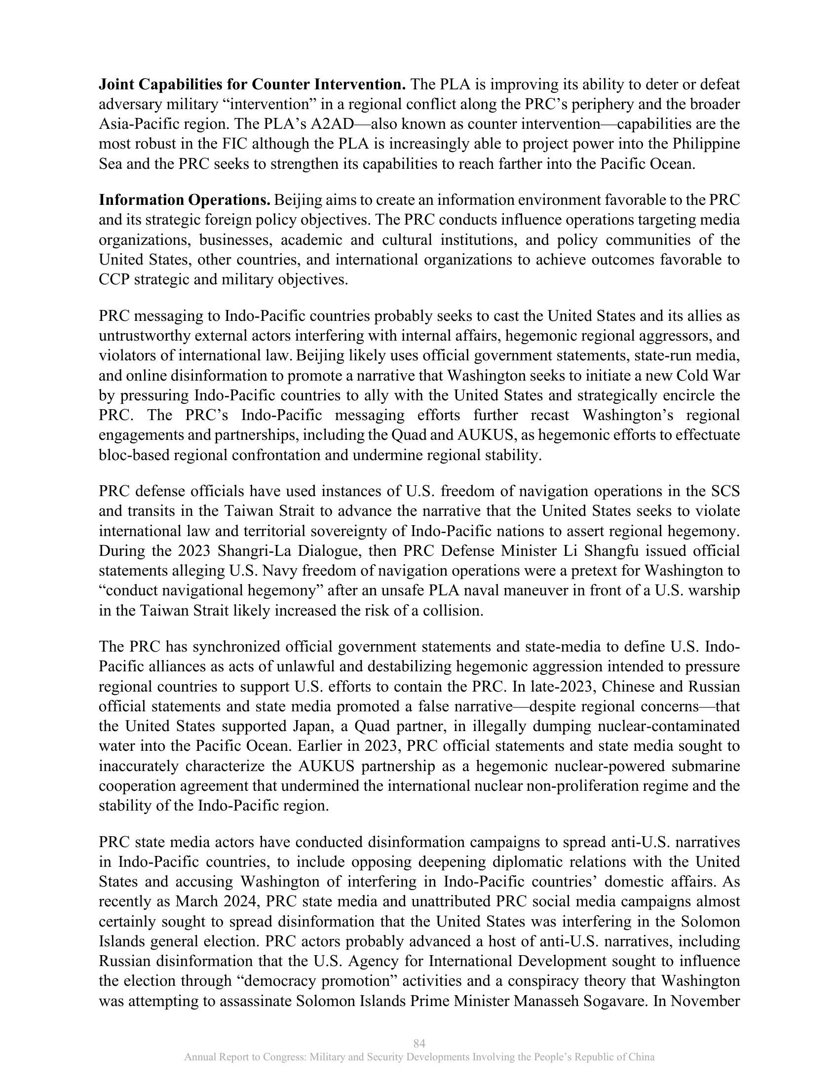 2023년, PRC는 PLA를 점점 더 강력한 국가 권력 수단으로 만들기 위한 노력을 계속 이어갔습니다. 한 해 동안 PLA는 인도-태평양 지역에서 보다 강압적인 행동을 취했으며, ‘강한 적’과의 전쟁에서 ‘싸워 이길 수 있는’ 능력, PRC 주변에서의 분쟁에 제3자가 개입하는 것을 저지할 수 있는 능력, 그리고 전 세계적으로 군사력을 투사할 수 있는 능력을 강화하기 위한 능력 개발과 개념 발전을 가속화했습니다. 또한, 2023년 11월 바이든 대통령과 시진핑 국가주석의 회담 이후, 실무급 및 고위급 군사 간 대화 채널이 재개되었습니다.