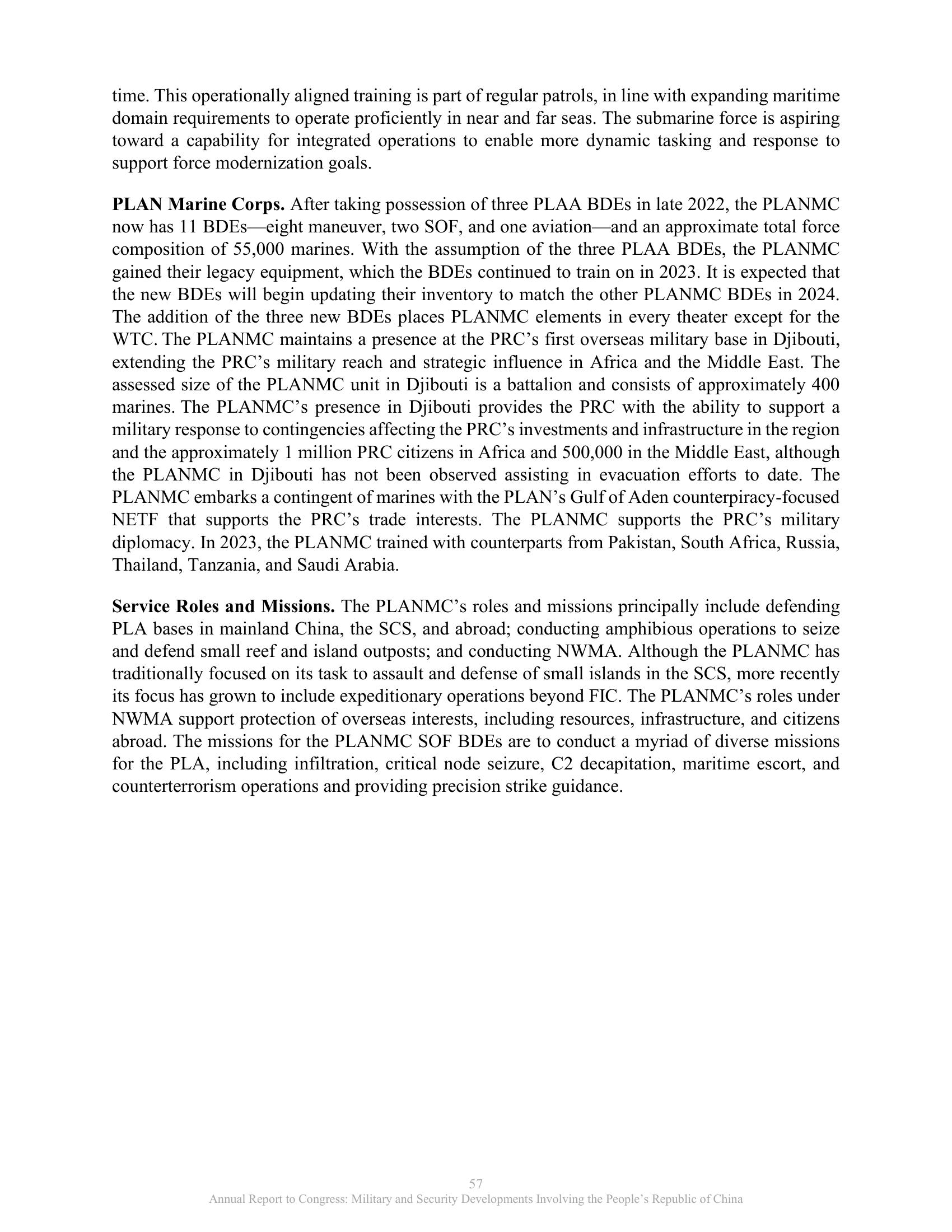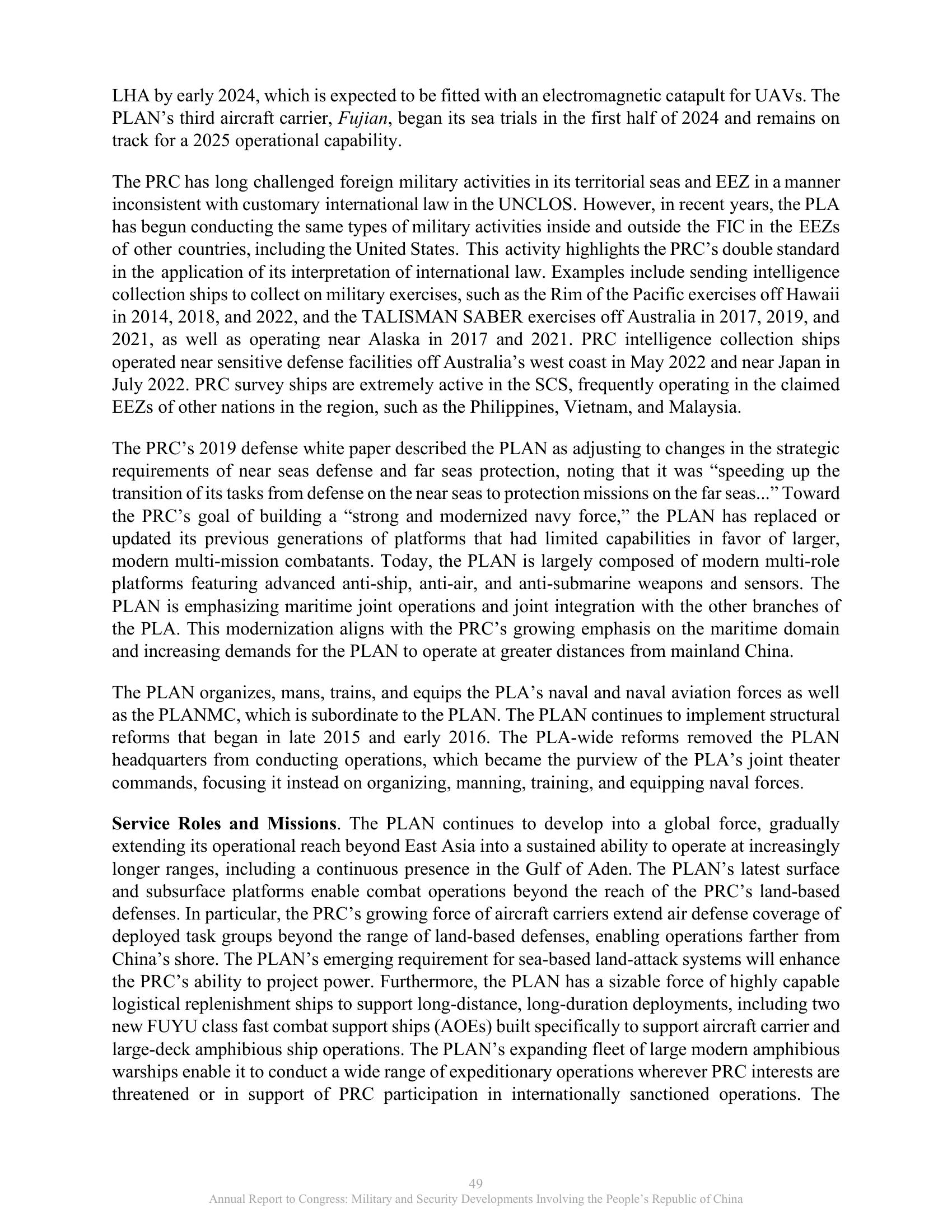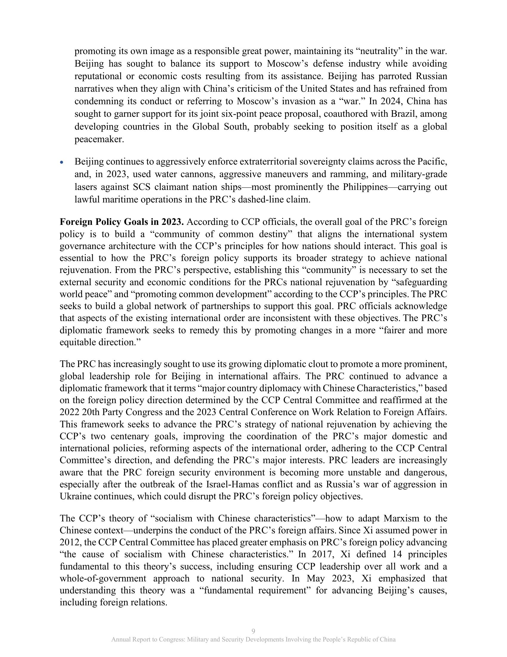2023년, PRC는 PLA를 점점 더 강력한 국가 권력 수단으로 만들기 위한 노력을 계속 이어갔습니다. 한 해 동안 PLA는 인도-태평양 지역에서 보다 강압적인 행동을 취했으며, ‘강한 적’과의 전쟁에서 ‘싸워 이길 수 있는’ 능력, PRC 주변에서의 분쟁에 제3자가 개입하는 것을 저지할 수 있는 능력, 그리고 전 세계적으로 군사력을 투사할 수 있는 능력을 강화하기 위한 능력 개발과 개념 발전을 가속화했습니다. 또한, 2023년 11월 바이든 대통령과 시진핑 국가주석의 회담 이후, 실무급 및 고위급 군사 간 대화 채널이 재개되었습니다.
