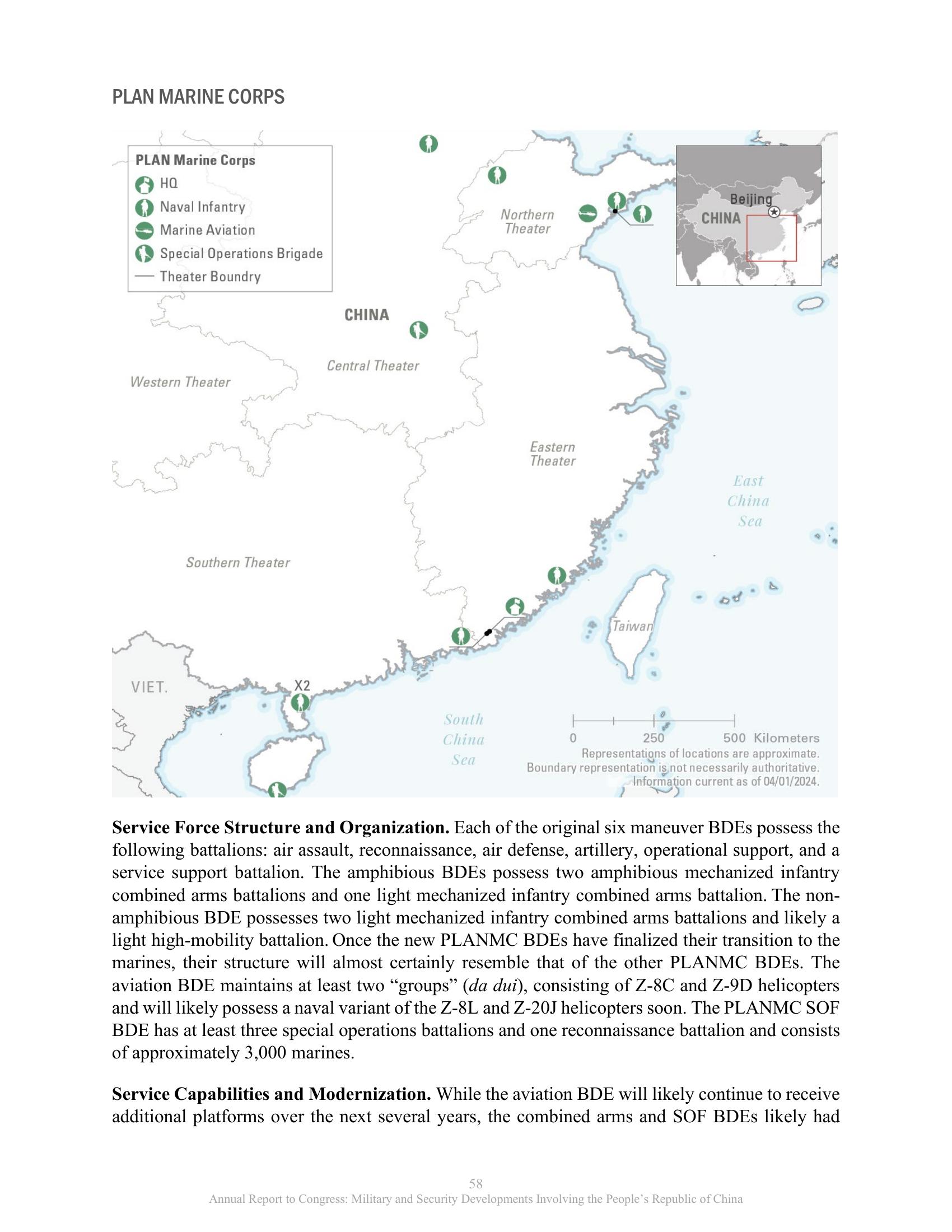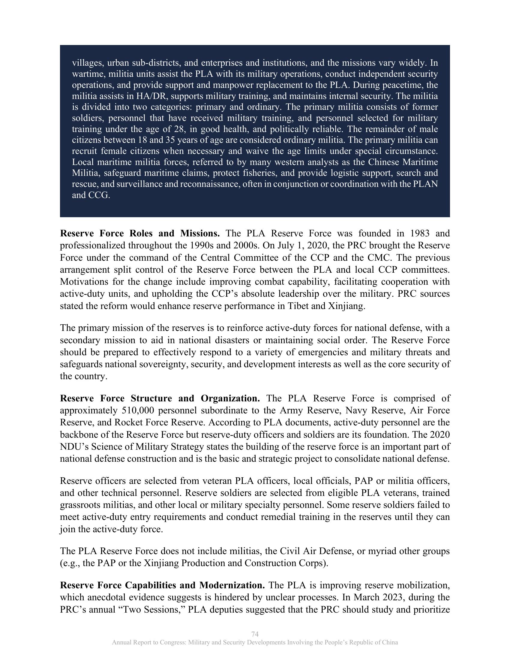예비군, 준군사력 및 민병대는 PLA와의 상호운용성과 통합 수준을 높이고 있습니다. 해군, 중국 해안경비대(CCG), 민병대(CMM)가 조율되어 중국의 해양 압박 작전을 수행하며, 해군은 억지전 과잉 대응을 위한 감시 역할을 합니다. 중국 인민무장경찰(PAP)은 내무·해양 안전 및 분쟁 시 PLA 보조 임무를 수행합니다.