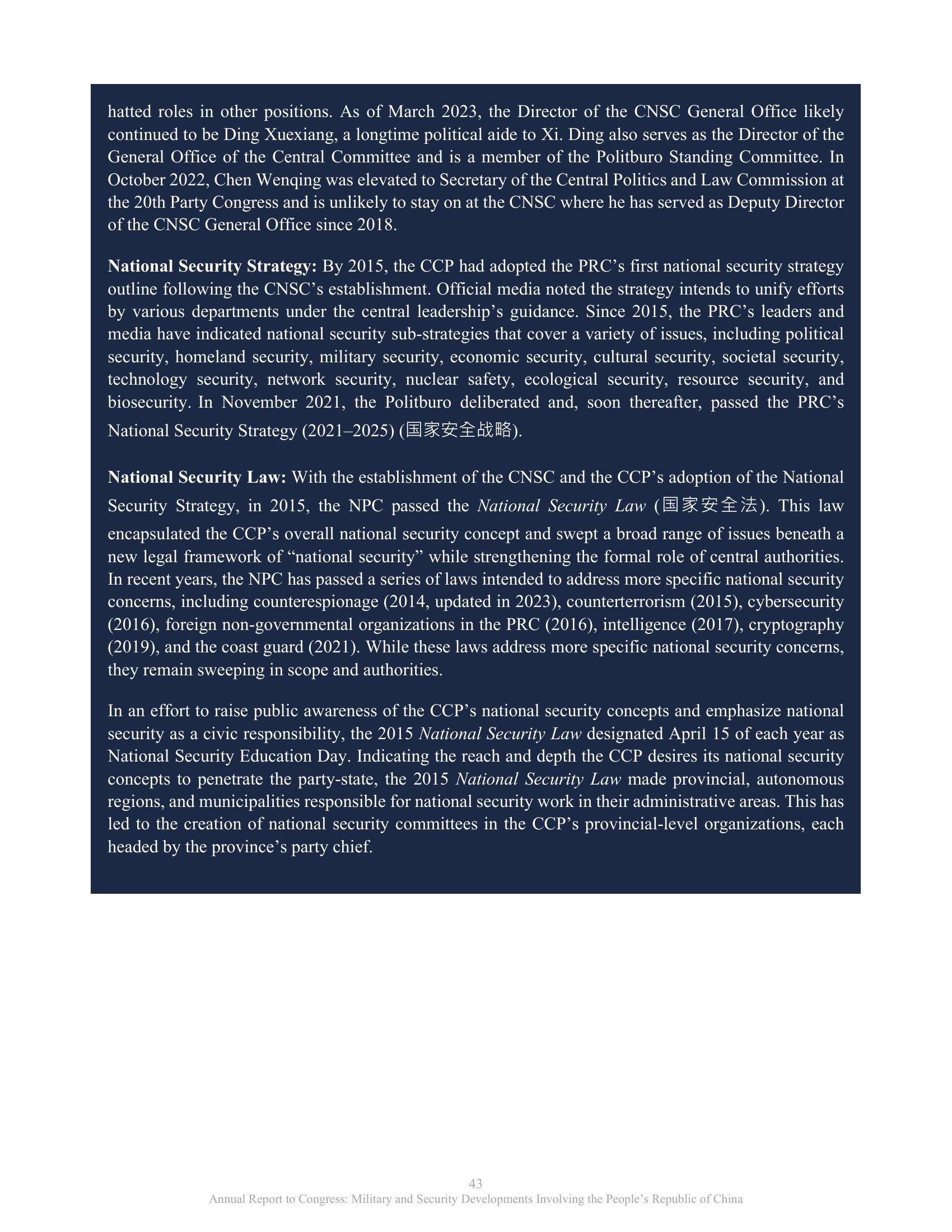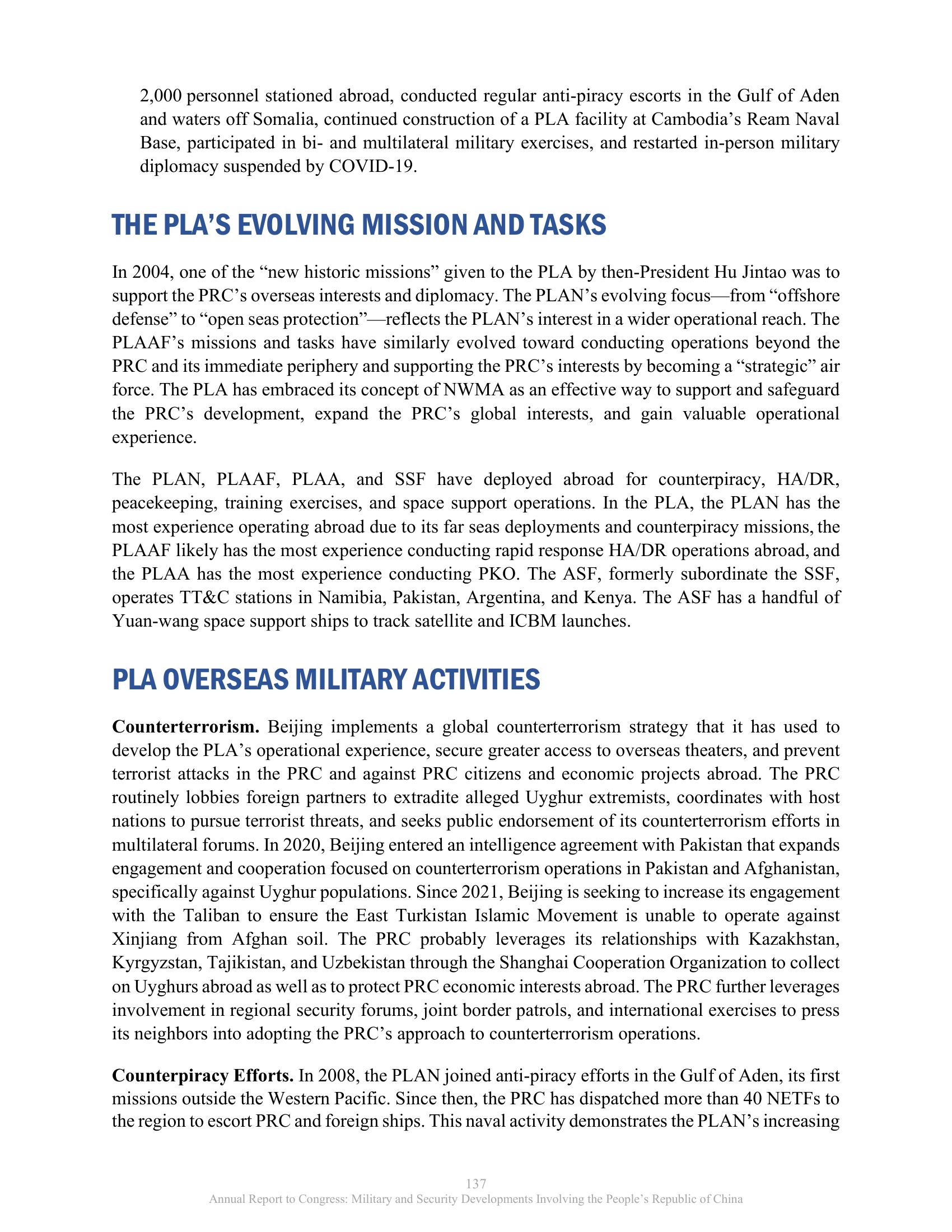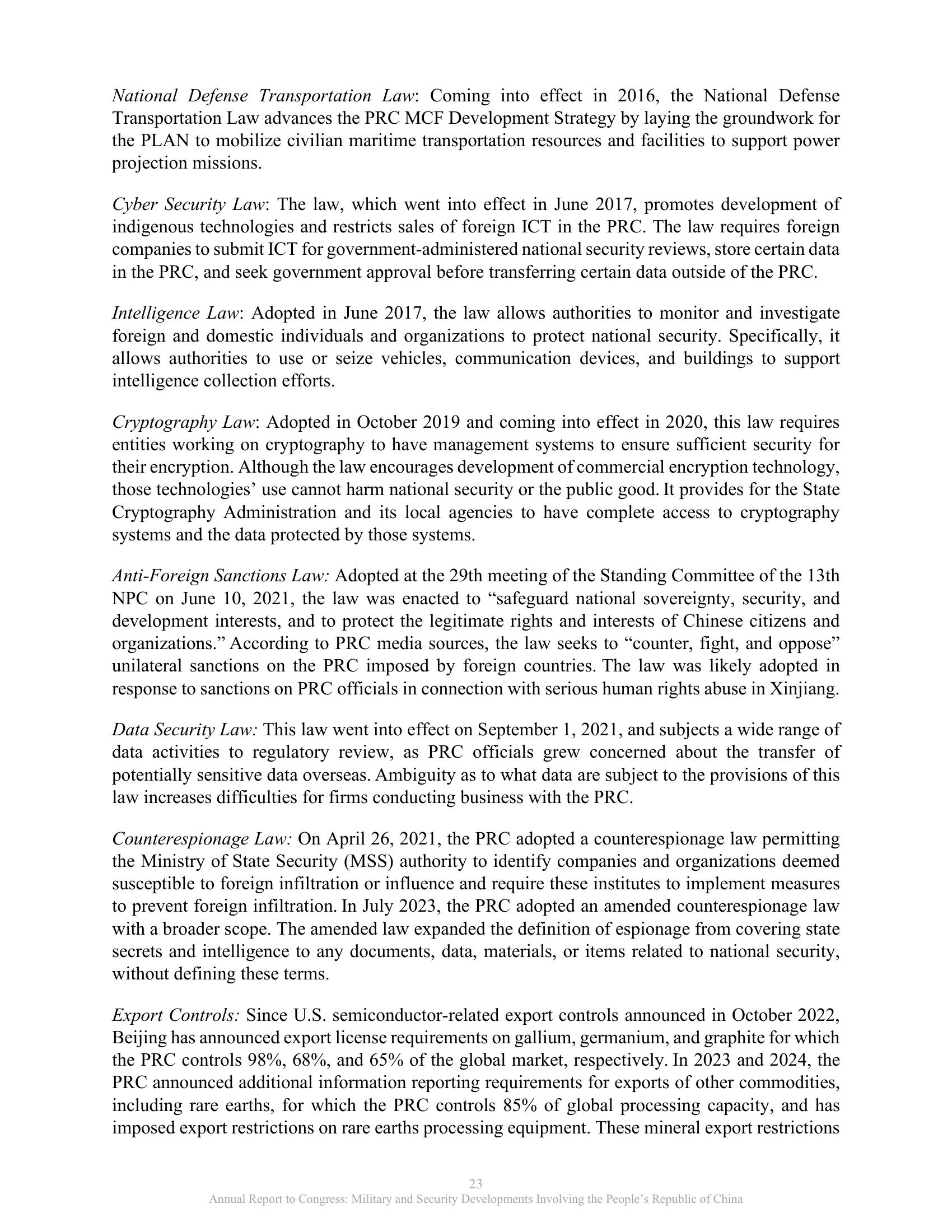 국방부의 연례 보고서인 **『중화인민공화국 관련 군사 및 안보 동향』**은 PRC의 국가 전략, 경제 전략, 군사 전략의 흐름을 분석하고, **중국인민해방군(PLA)**의 전략, 현재 역량과 활동, 향후 현대화 목표에 대한 통찰을 제공합니다.