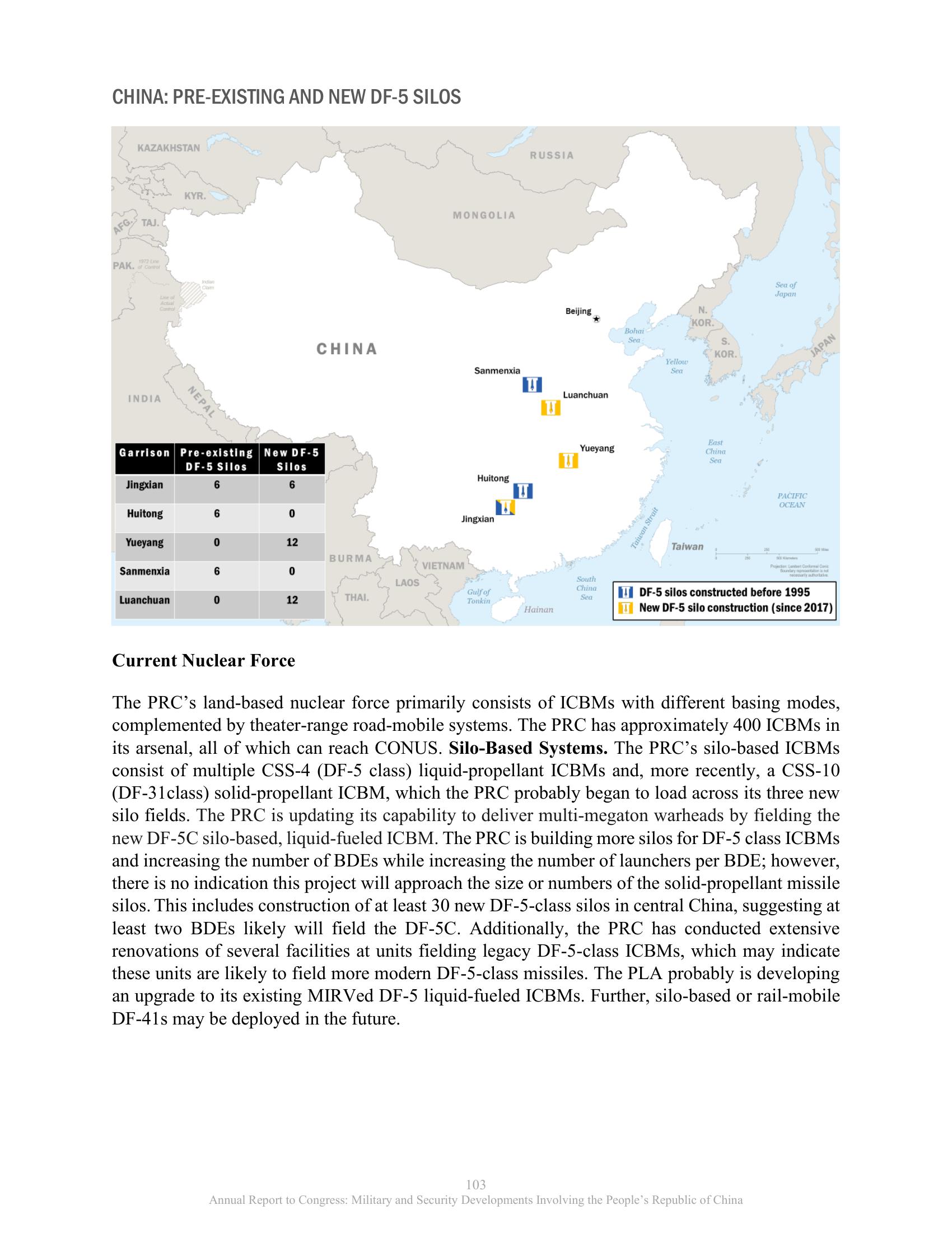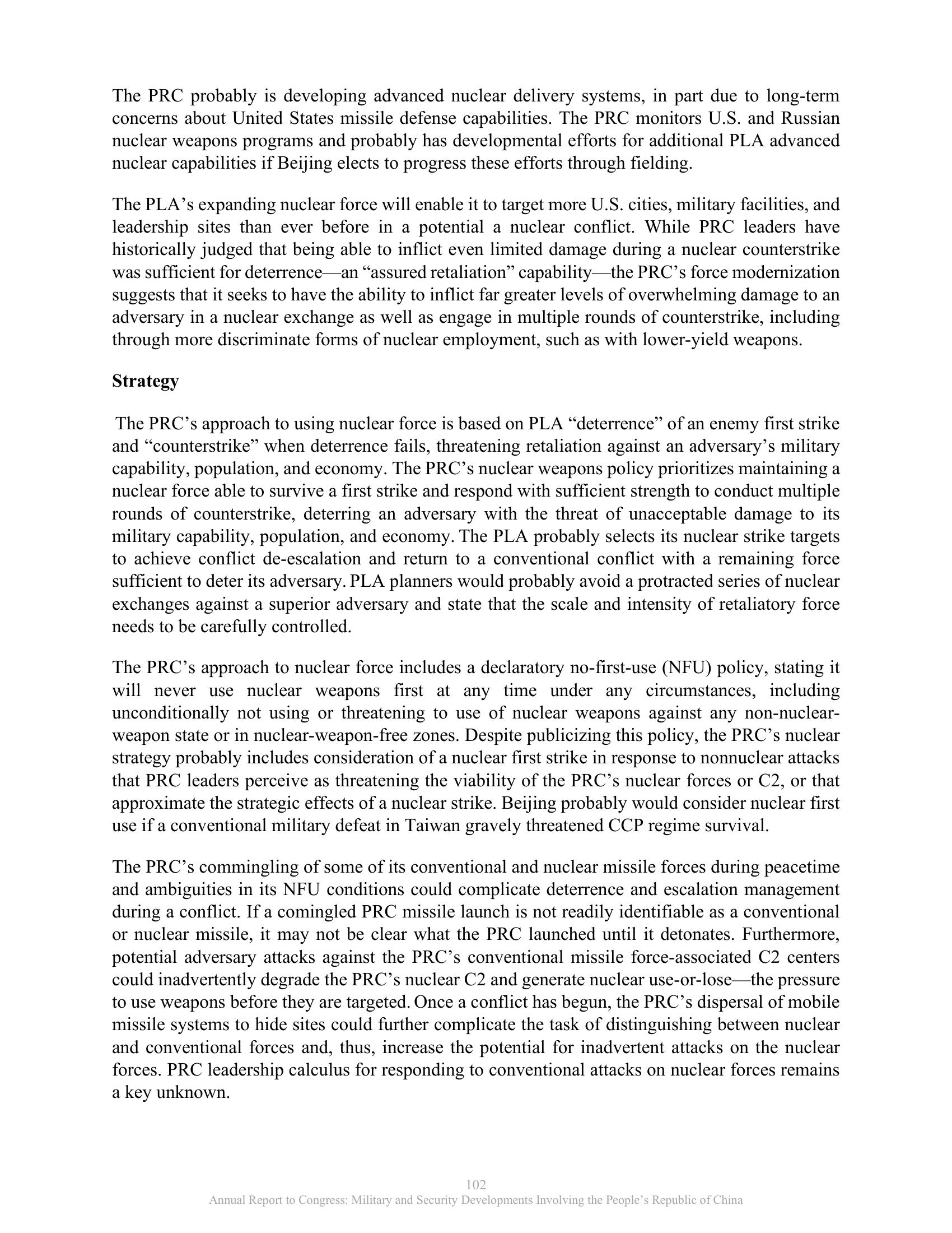 장기적 현대화 계획을 추진하며 전략 억제(strategic deterrence) 역량을 확대하고 있습니다. 신형 대륙간탄도미사일(ICBM)을 개발하여 핵미사일 역량을 크게 개선 중이며, 양적으로는 핵탄두 생산량이 늘어나야 합니다. 비핵 ICBM 개발도 탐색 중이며, 미국 본토·하와이·알래스카에 대한 기존 무력 타격 역량도 강화되고 있습니다.