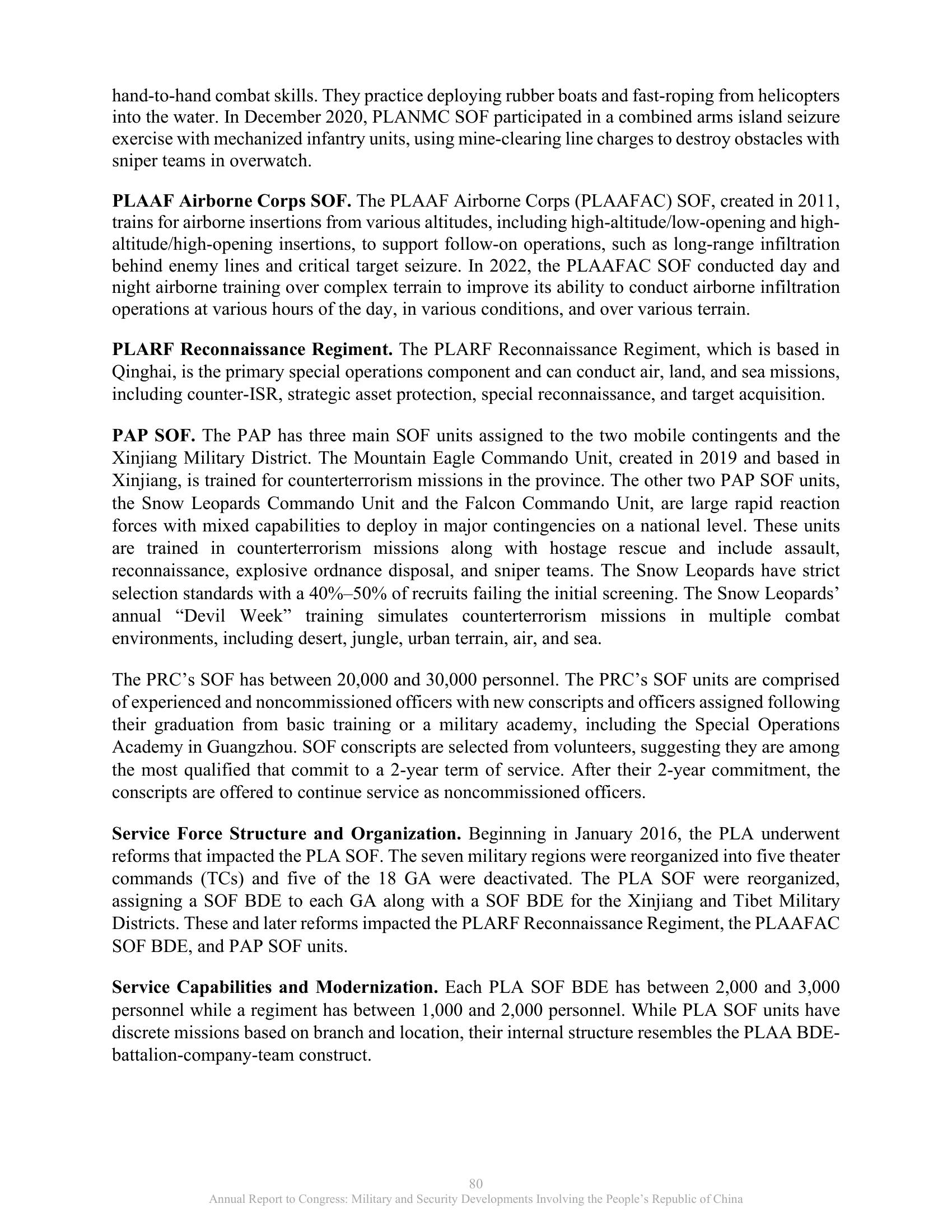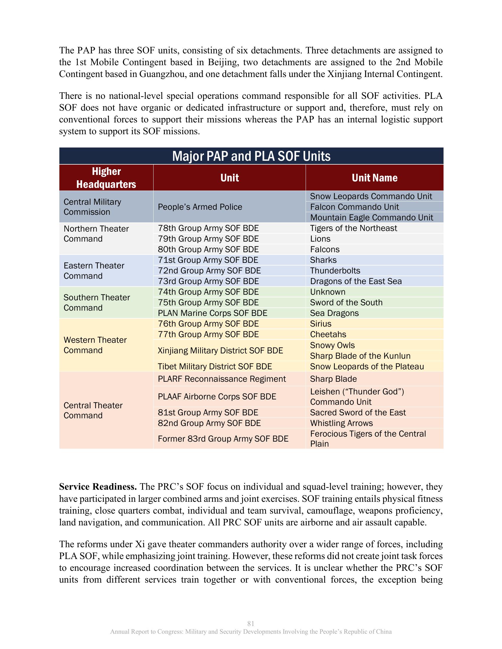 훈련은 확대되고 있으나, 실전 경험이 부족하며 국가급 특수작전 통합 사령부도 없습니다. 또한, 군구급 지휘체계에서는 PAP 부대를 훈련에 유기적으로 통합하기 어려운 구조적 제약이 있습니다.