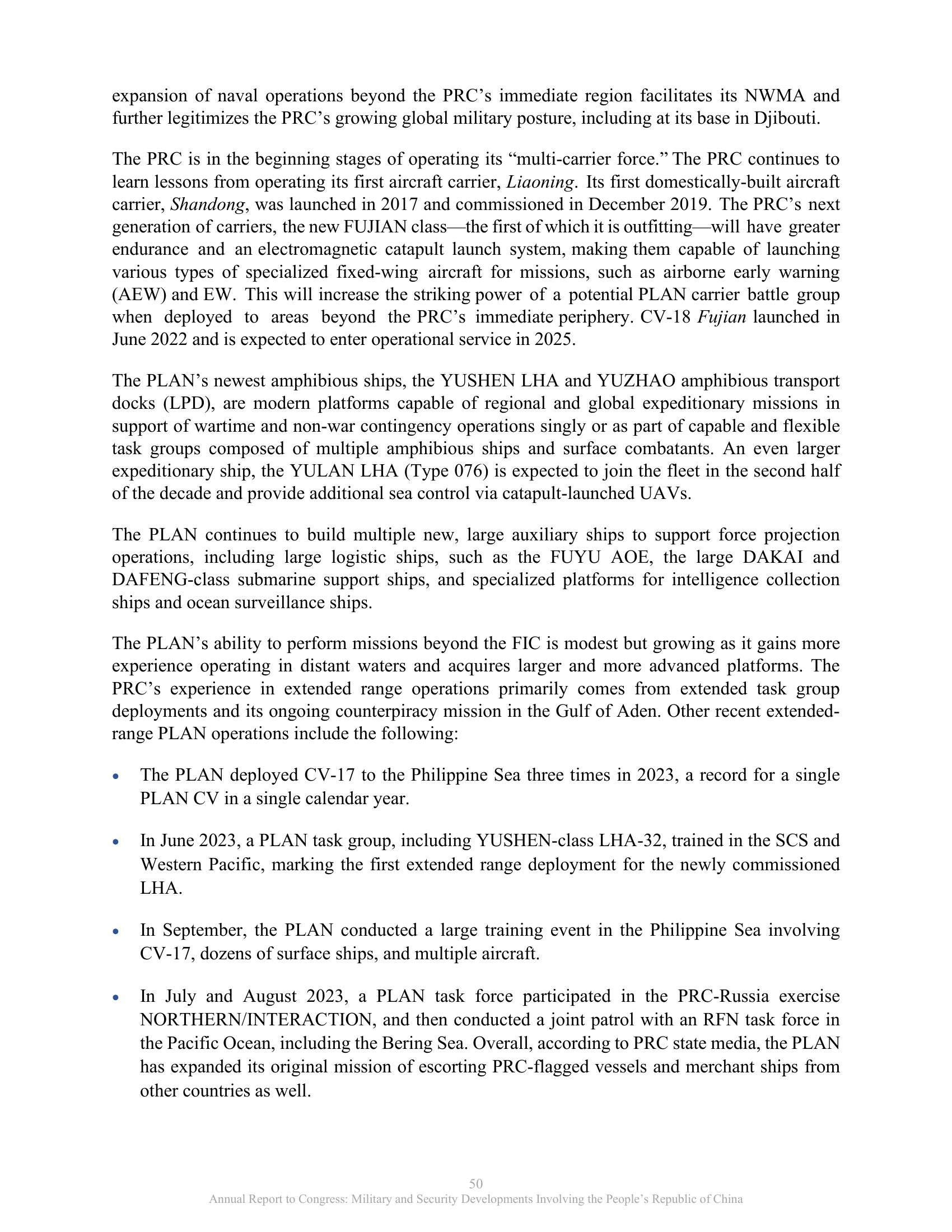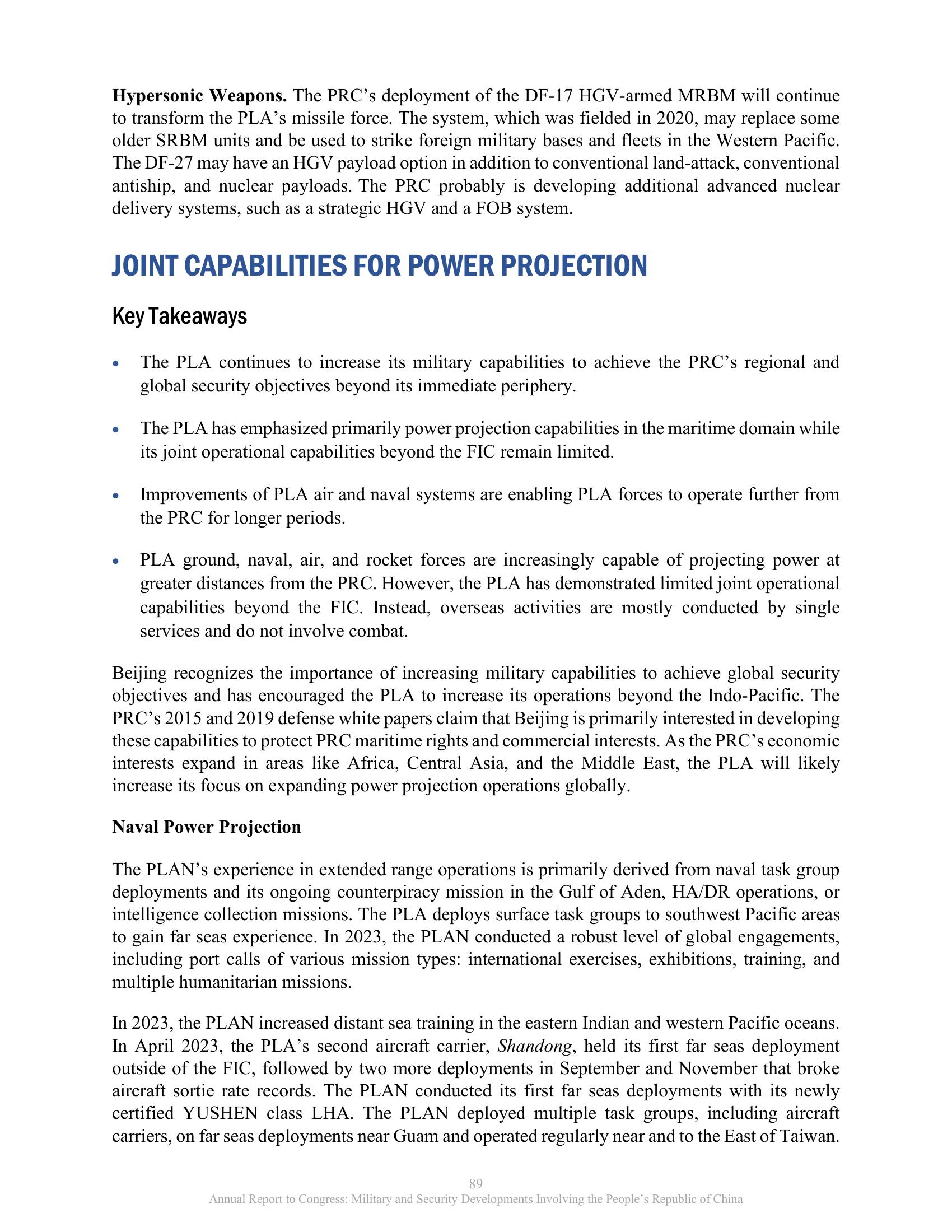 중국은 해군 중심의 원양 투사력 강화에 주력하고 있으며, 공군과 합동작전 능력도 FIC 너머 장거리 작전 수행이 가능한 수준으로 향상되고 있습니다.