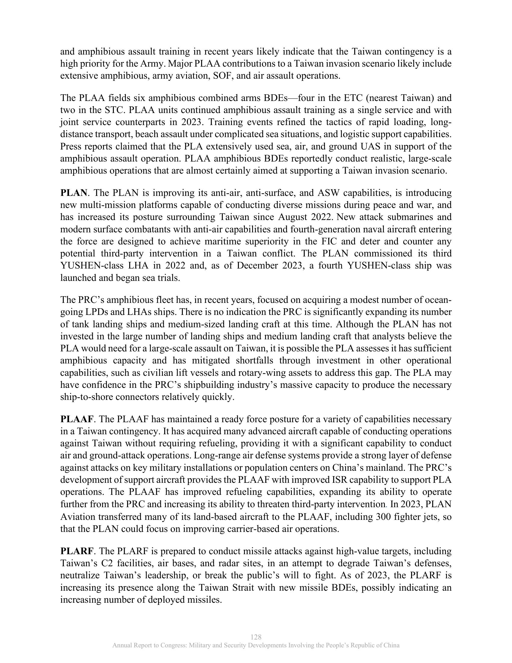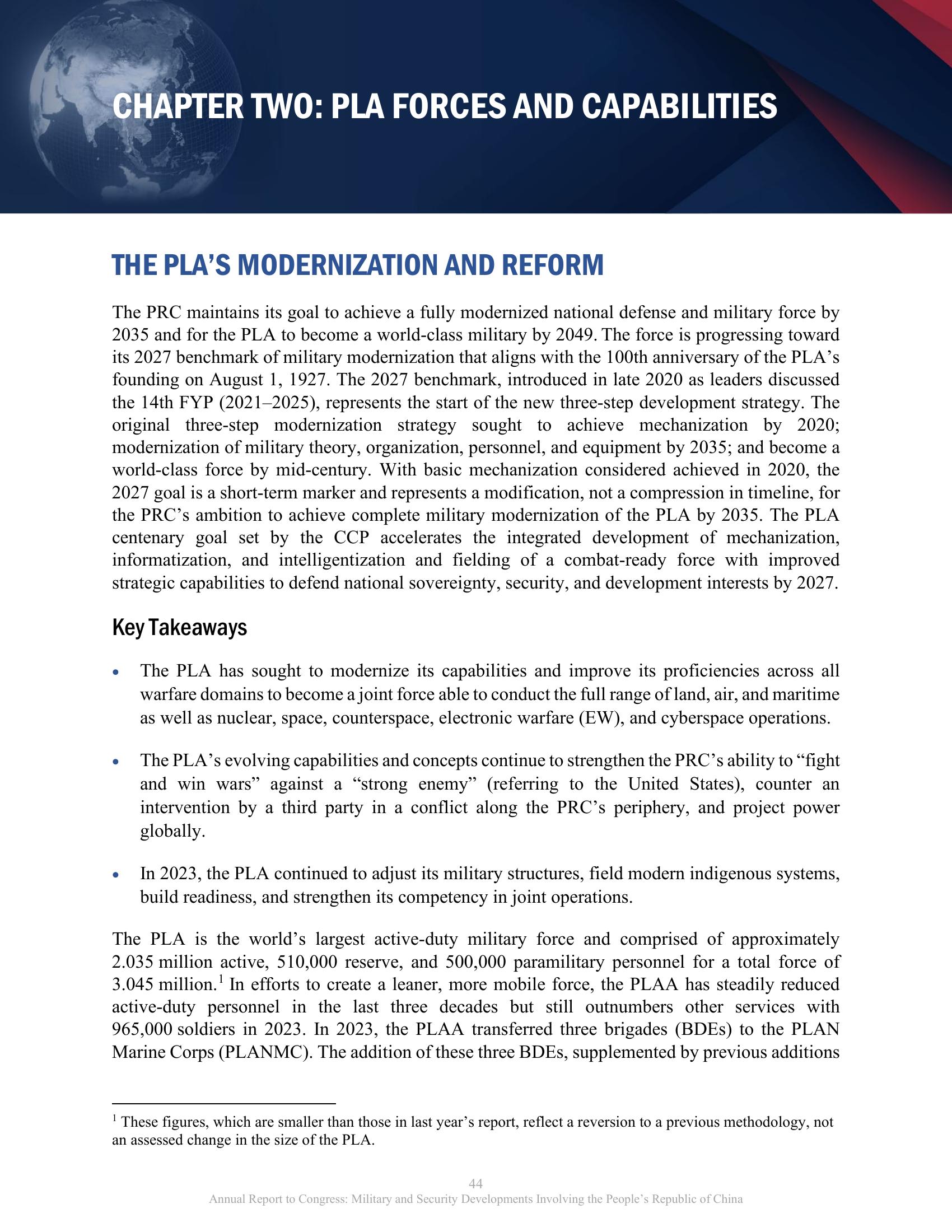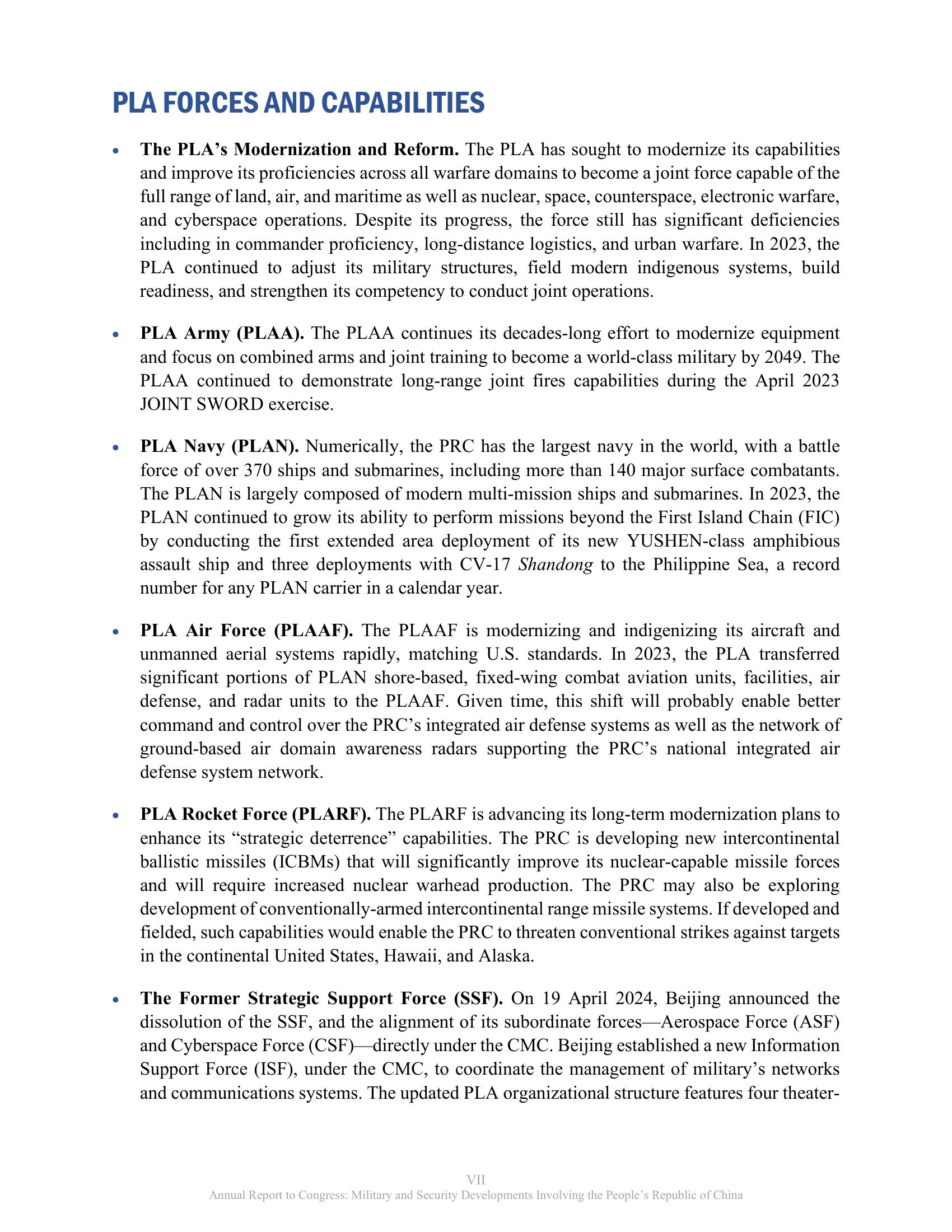 PLA는 육·해·공을 비롯한 핵·우주·전자·사이버·대우주·대공간 등 전 분야에서 통합 전력을 구축하는 데 주력하고 있습니다. 다만 지휘관 숙련도, 장거리 병참, 도심전 전술 등에서 여전히 부족한 부분이 남아 있습니다. 2023년에는 군 구조 조정, 국산 무기 배치, 대비태세 강화, 합동작전 능력 향상에 집중했습니다.