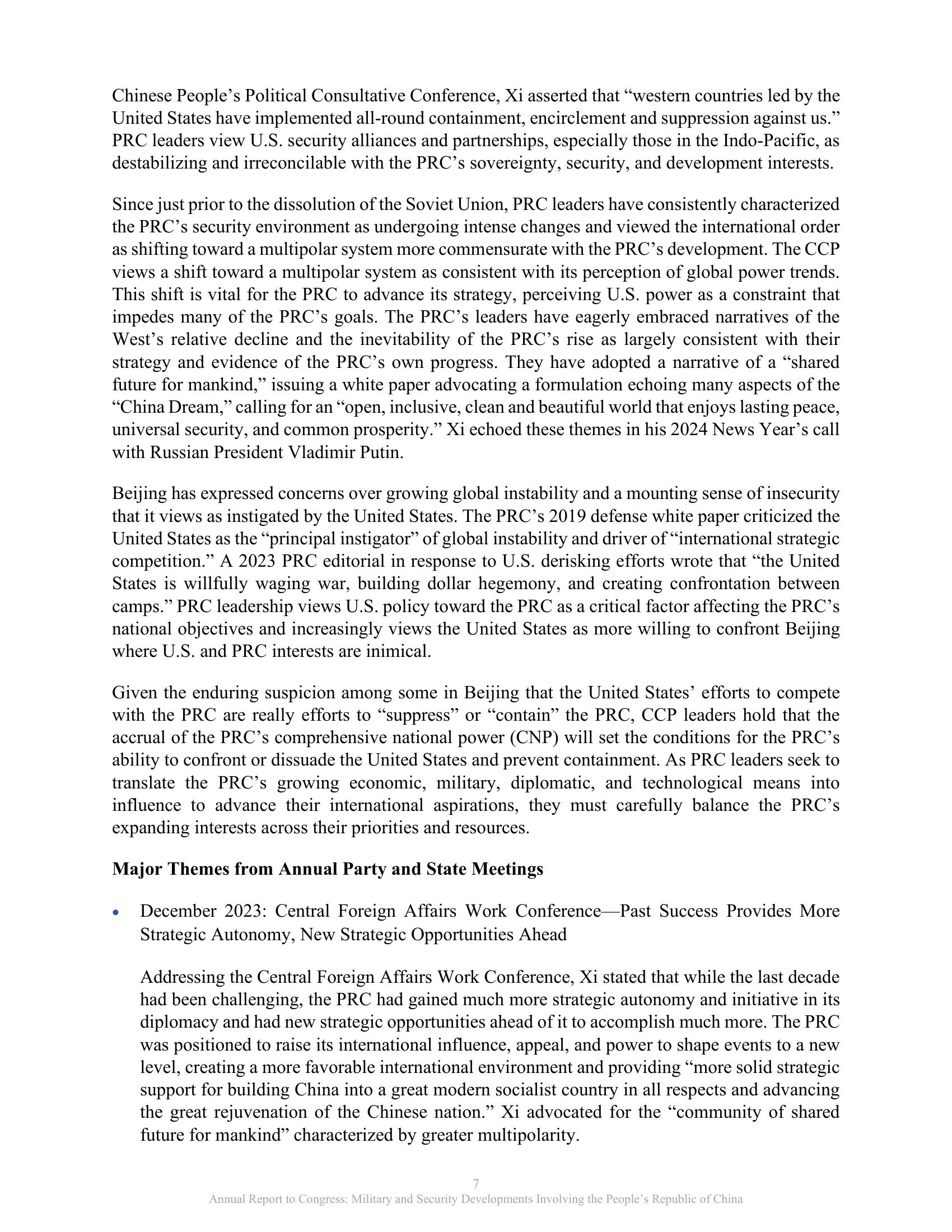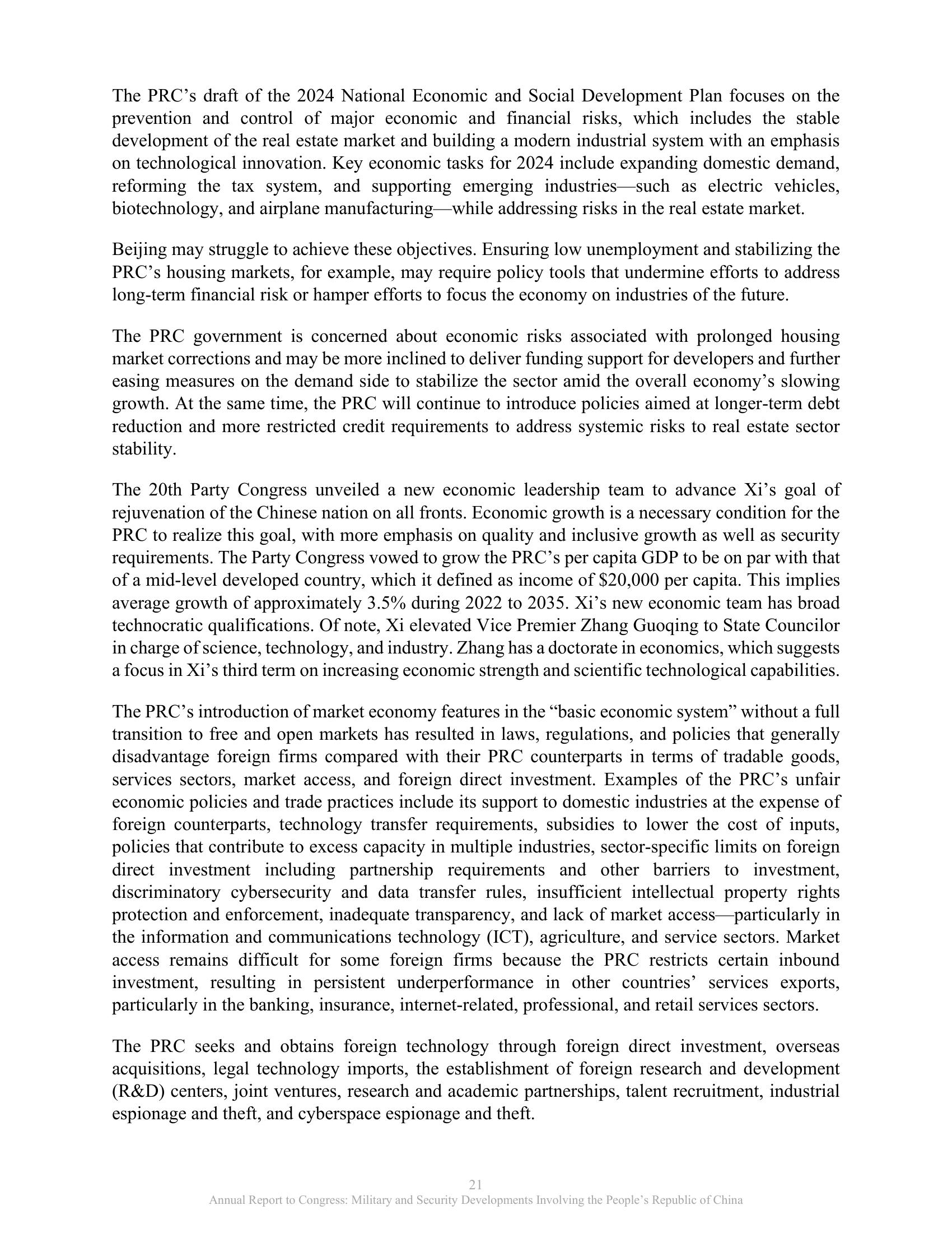중국은 2023년 경제 회복과 성장에 내부·외부 도전이 복합적으로 작용했음을 인정했습니다. 2024년에는 장기 성장 궤적의 유리한 요소를 활용하면서 경제 안정에 대한 리스크를 완화하려 합니다. 국방 현대화 목표 역시 첨단 제조업과 기술 자립을 중점적으로 투자하는 국가 발전 야망과 맞닿아 있습니다.