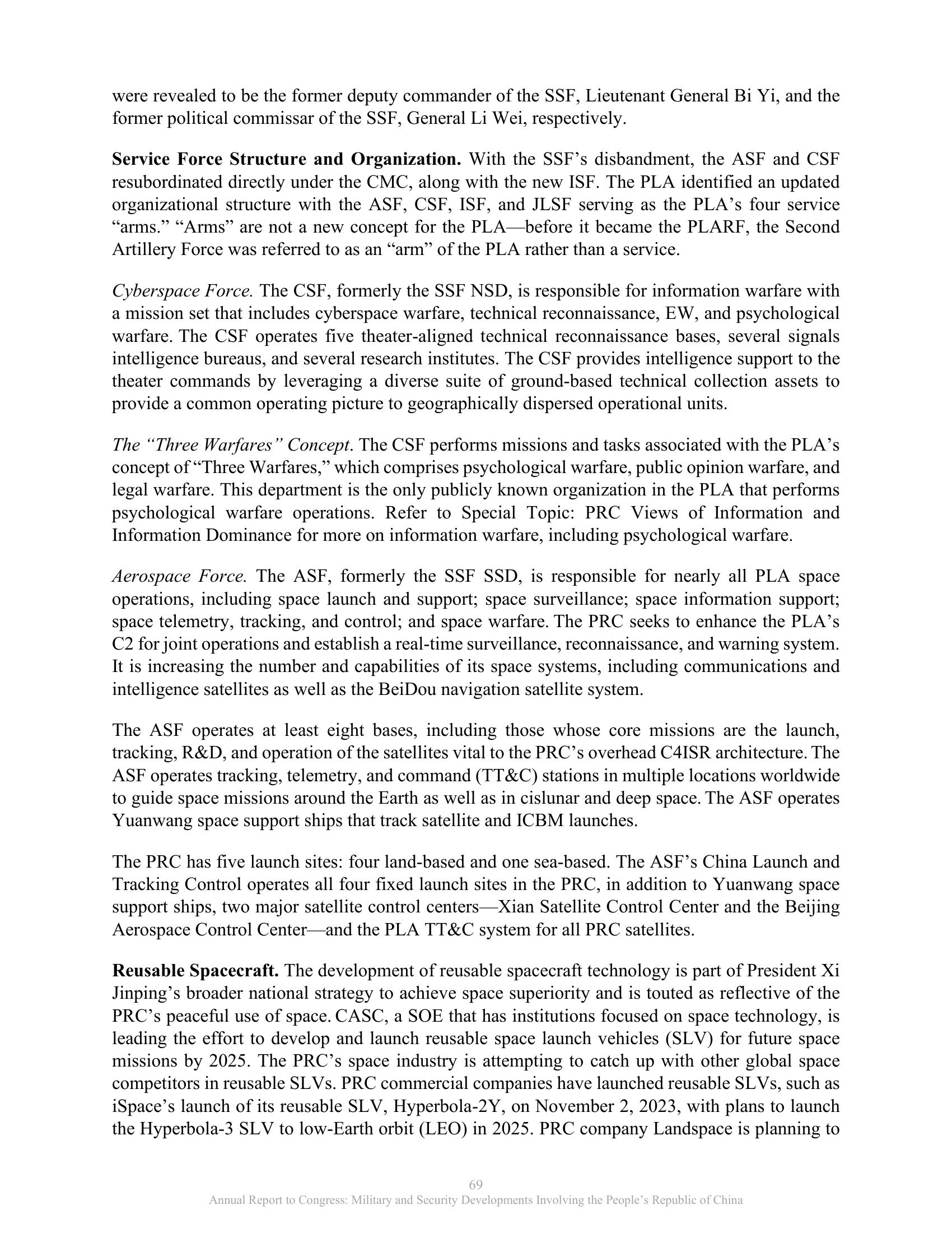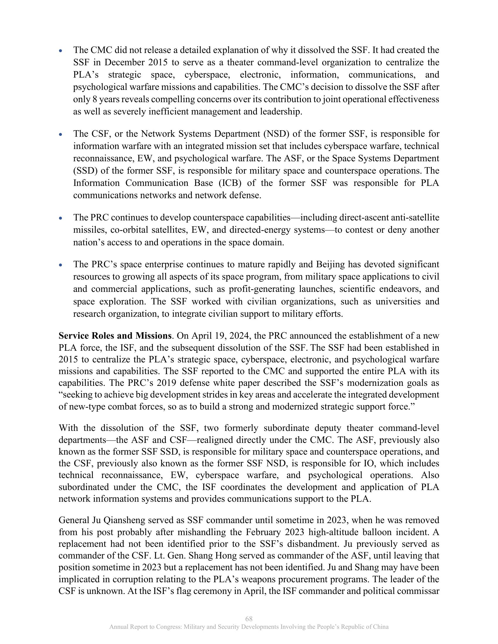 2024년 4월 19일 SSF가 폐지되고, 항공우주력(ASF)과 사이버력(CSF)이 CMC 직할로 편입되었습니다. 대신 통신·네트워크 관리를 전담하는 정보지원부대(ISF)가 신설되었습니다. 새로운 조직 체계는 총 4개 군(육·해·공·로켓군)과 4개 부대(ASF·CSF·ISF·합동군수지원부대 JLSF)로 구성됩니다.