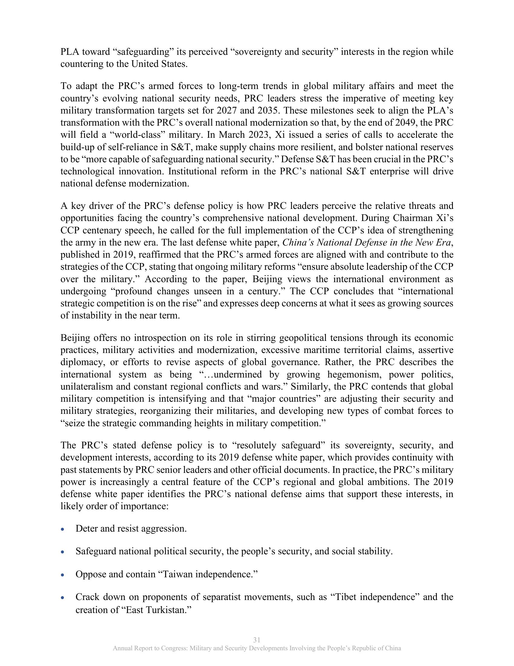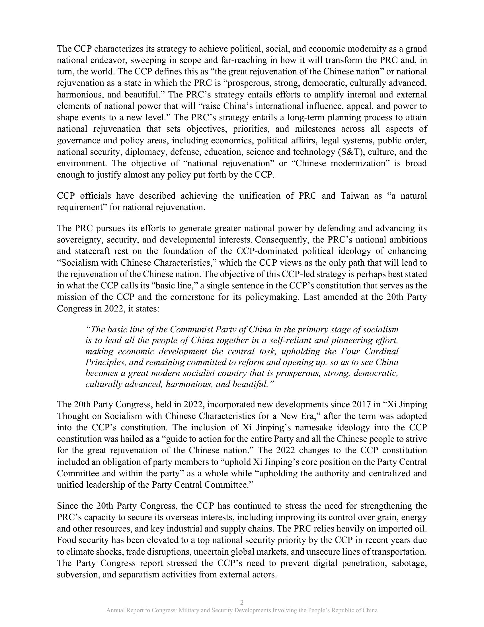 2022년 국가안보전략은 **중화인민공화국(PRC)**이 국제 질서를 재편하려는 의도를 갖고 있으며, 점점 더 그 능력을 갖추고 있는 미국의 유일한 경쟁국이라고 명시하고 있습니다. 이에 따라 2022년 국방전략은 PRC를 **국방부(DoD)의 ‘기준 도전(pacing challenge)’**으로 규정하고 있습니다. PRC는 2049년 건국 100주년을 맞아 "국가의 부흥"을 달성하기 위해 노력하고 있으며, 중국공산당(CCP) 지도부는 현대적이고, 유능하며, ‘세계 수준’의 군대를 그 수정주의적 목표를 실현하고 베이징이 인식하는 점점 더 불안정한 국제 환경을 극복하는 데 필수적인 요소로 보고 있습니다.