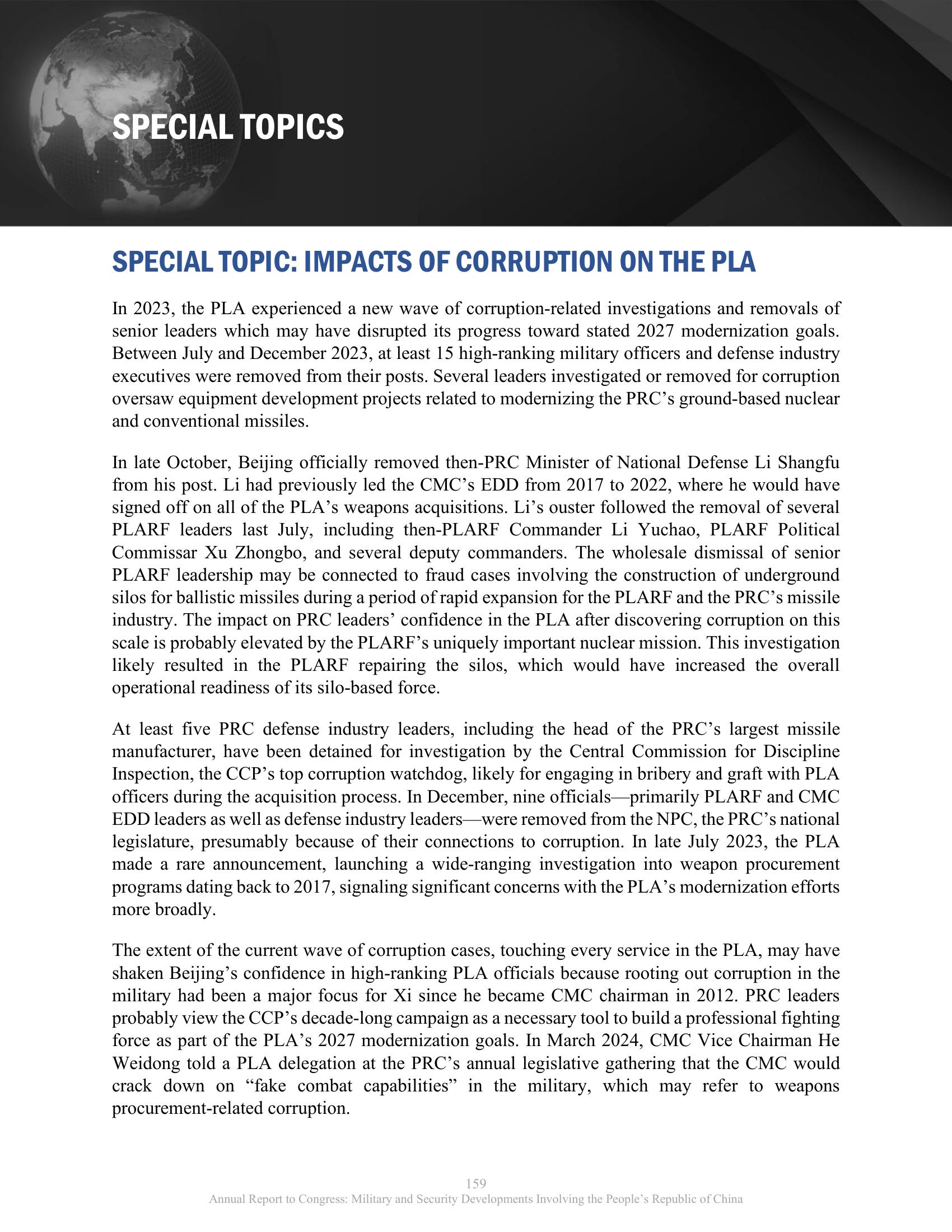 2023년 대대적인 부패 척결과 고위급 제거가 PLA의 2027년 현대화 목표 달성에 일시적 지장을 줄 수 있습니다. 2023년 7월~12월 사이 최소 15명의 고위 장성 및 국방 산업 임원이 직위 해제되었으며, 이 중 리상푸 전 국방부 장관의 해임이 가장 주목됩니다.