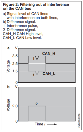 The two-wire cable facilitates a symmetrical data transfer, in which the bits are transferred via both bus lines using different voltages. This reduces sensitivity to common-mode interference, since interference affects both lines and can be filtered out by creating the difference (Figure 2).