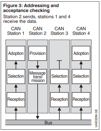 CAN uses message-based addressing. This involves assigning a fixed identifier to each message. The identifier (ID) classifies the content of the message (e.g. engine speed). Each station processes only messages whose identifiers are stored in the list of messages to be accepted. This is called acceptance checking (Figure 3). Thus, the CAN requires no station addresses for data transmission, and the nodes are not involved in managing the system configuration. This facilitates adaptation to variations in equipment levels.