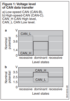 High-speed and low-speed CANs use different voltage levels to transfer dominant and recessive states. The voltage levels of the low-speed CAN are shown in Figure 1a, those of the high-speed CAN in Figure 1b. The high-speed CAN uses, in the recessive state on both lines, a nominal voltage of 2.5 V. In the dominant state, nominal voltages of 3.5 V and 1.5 V are applied to CAN_H and CAN_L respectively. In the low-speed CAN in the recessive state, a voltage of 0 V (max. 0.3 V) is applied to CAN_H and a voltage of 5 V (min. 4.7 V) is applied to CAN_L. In the dominant state, the voltage at CAN_H is min. 3.6 V and at CAN_L max. 1.4 V.