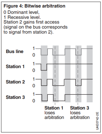 Each station can begin transmitting a message as soon as the bus is unoccupied. When several stations start to transmit simultaneously, a “wired-and arbitration scheme” becomes active to resolve the resulting bus-access conflicts. The arbitration scheme ensures that the dominant bits transmitted by a station overwrite the recessive bits of other stations (Figure 4). Each station gives bit by bit – the highest significant bit first – the identifier of its message on the bus. During this arbitration phase (selection phase) each transmitting station compares the applied bus level with the actual level. Each station that transmits a recessive bit but observes a dominant bit loses arbitration. The station with the lowest identifier – i.e. with the highest priority – is assigned first access on the bus without having to repeat the message (non-destructive access control). Transmitters respond to failure to gain bus access by automatically switching to receive mode; they then repeat the transmission attempt as soon as the bus is free again.