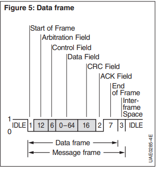 The CAN supports two different message formats, which primarily differ with respect to the length of their identifiers. The standard format has 11 bits, while the extended format has 29 bits. Thus, the data frame to be transmitted contains a maximum of 130 bits (in the standard format) and 150 bits (in the extended format). This ensures minimum waiting time until the next transmission (which could be urgent). The data frame for the standard format consists of seven consecutive fields (Figure 5). The “Start of Frame” indicates the beginning of a message and synchronizes all nodes.