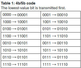 means of clock data recovery (CDR). To enable the clock to be recovered even in the event of many consecutive “0” or “1”, a special 4b/5b encoding as depicted in Table 1 is used: Every fourth bit is inverted and then sent again. With this encoding there is a change from “0” to “1” or vice versa after five clocks at the latest. The drawback is that five bits have to be sent over the bus to transmit four data bits.