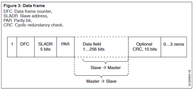 Figure 3 shows a data frame in detail. The leading 1 identifies the frame as a data frame. A 01 would indicate a zero frame and a 0010 an interrupt frame.