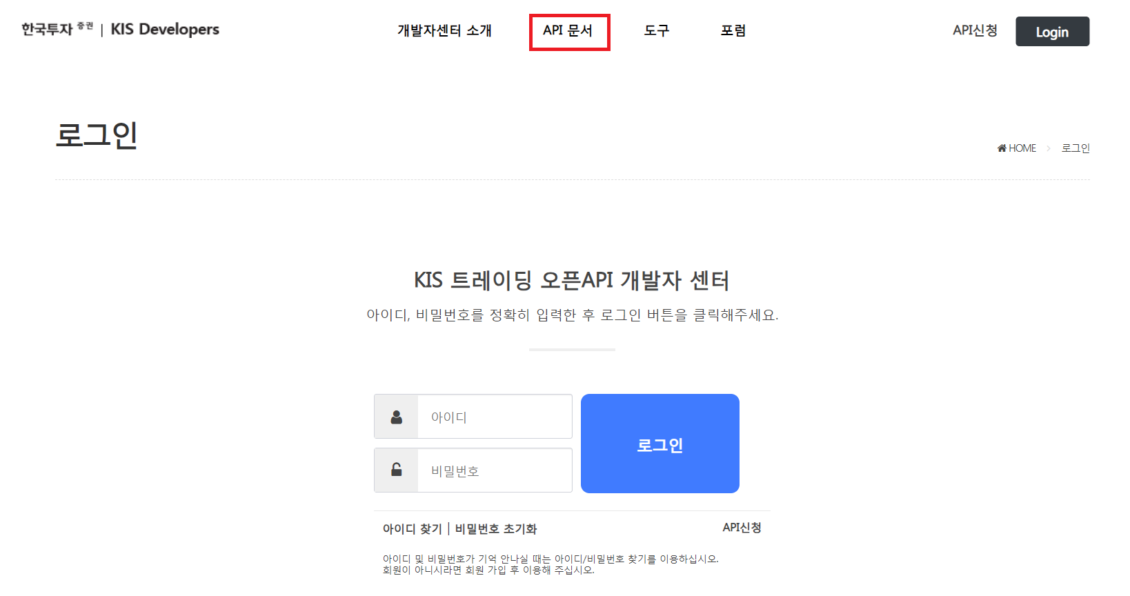 한국투자증권 OpenApi 주소 링크 : https://apiportal.koreainvestment.com/apiservice